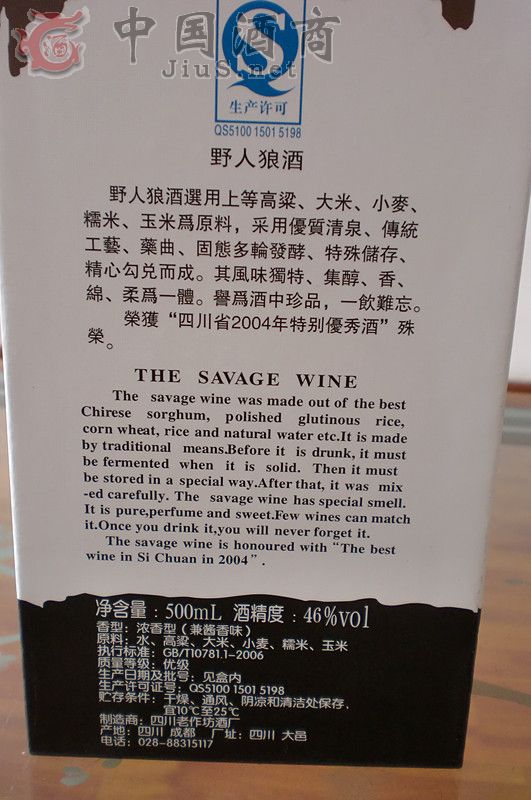 “野人狼”酒選用優質紅糧、糯米、小麥、稻谷、黃豆及優質清泉、精制藥曲。采用傳統工藝,揉進現代技術,固態多輪發酵,特殊貯存,精心勾兌而成。 “野人狼”風味獨特。有濃香型的特點,以略有醬香味的感覺,是集川酒的醇、香、綿、柔為一體的酒中極品,川酒中的奇葩。曾榮獲”四川省2002年特別優秀酒“稱號。